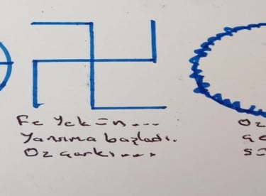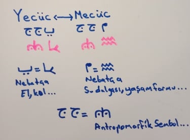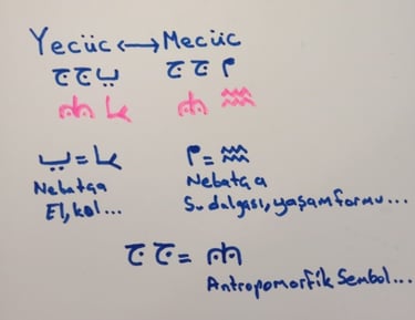 Nebat alfabesinde “ YE “ harfi el,kol anlamına gelir.Başınıza gelen elerinizin ettiklerindendir...” MİM “ harfi su dalgası,yaşam formu demektir.Her şeyi sudan yarattım... 2 Cim harfinden transforme ettiğim sembol bariz şekilde Humanoid formu işaret ediyor.Bozguncu bilamlar CERN’deki gibi faaliyetlerle imajiner alana müdahale edecekler. Antropomorfik sembolden anlıyoruz bunu.Mecüc formunda, A. alanına geçirmeye çalışacakları yasa frekansı harici yaşam formları.