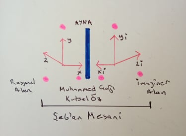 m . e = 7 / sani bu ifade sanki A Rasyonel alan ve B İmajiner alanların bütünü ile alakalı gibi durmakta. Kütlenin içinde barındırdığı Enerji ; Enerjinin içinde barındırdığı bürüneceği maddi Kütle...Ve bu bağıntının 7 / sani ile alakalı olduğu. Enerji-yi Sani:MADE ; Madde-i Sani: ENERJİ...